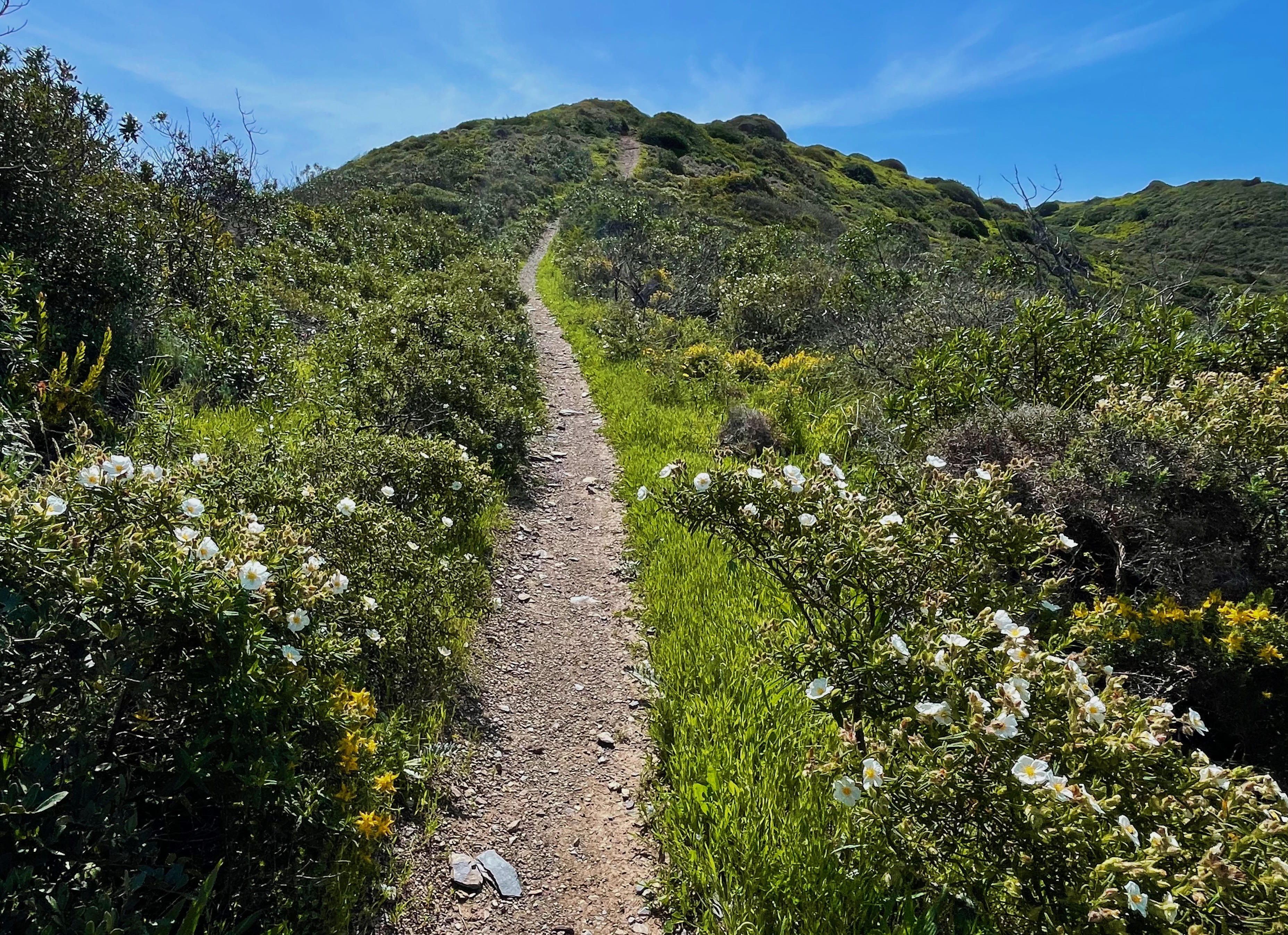 Wide tracks sweep down towards a magnificent coast through fields of spring flowers.