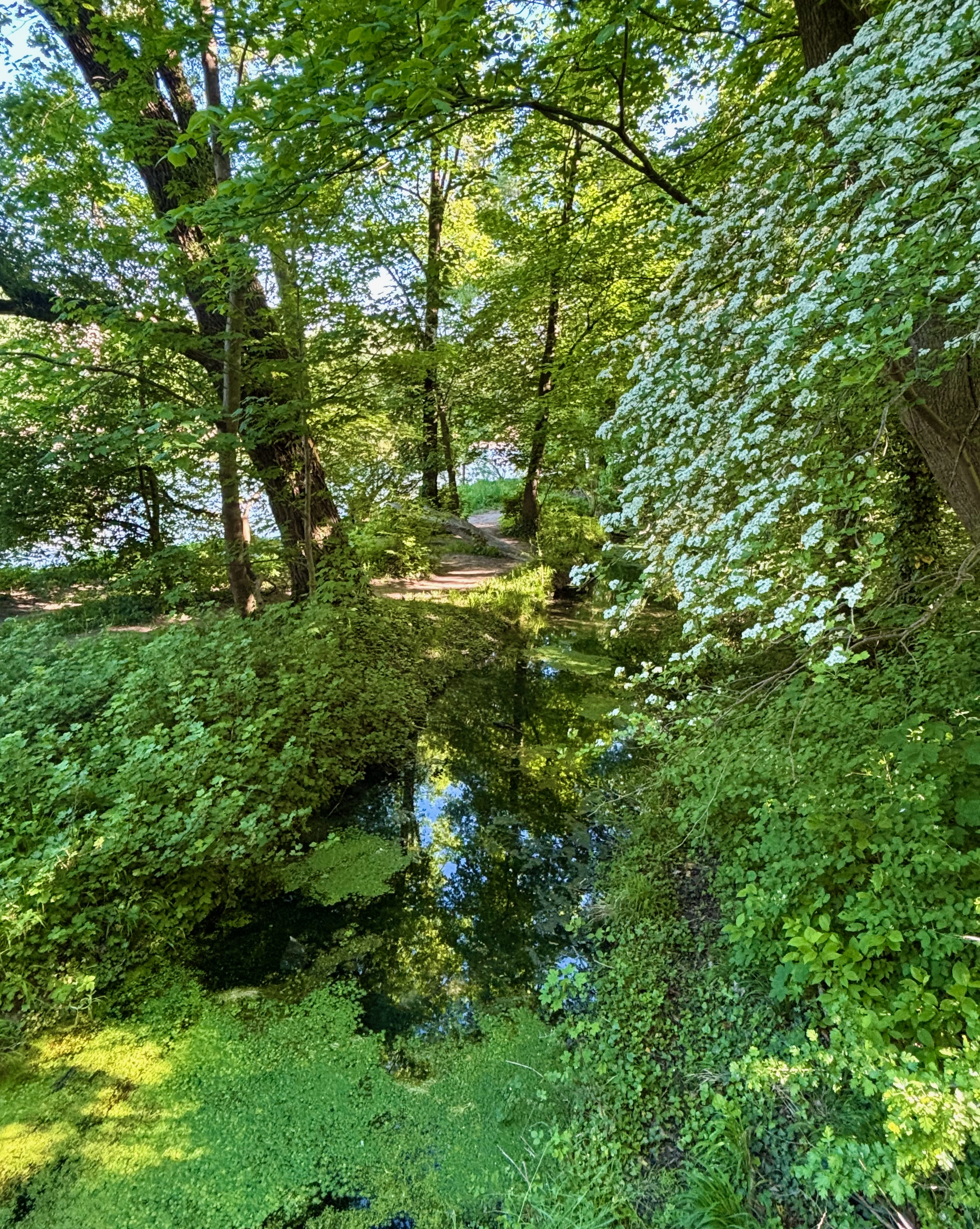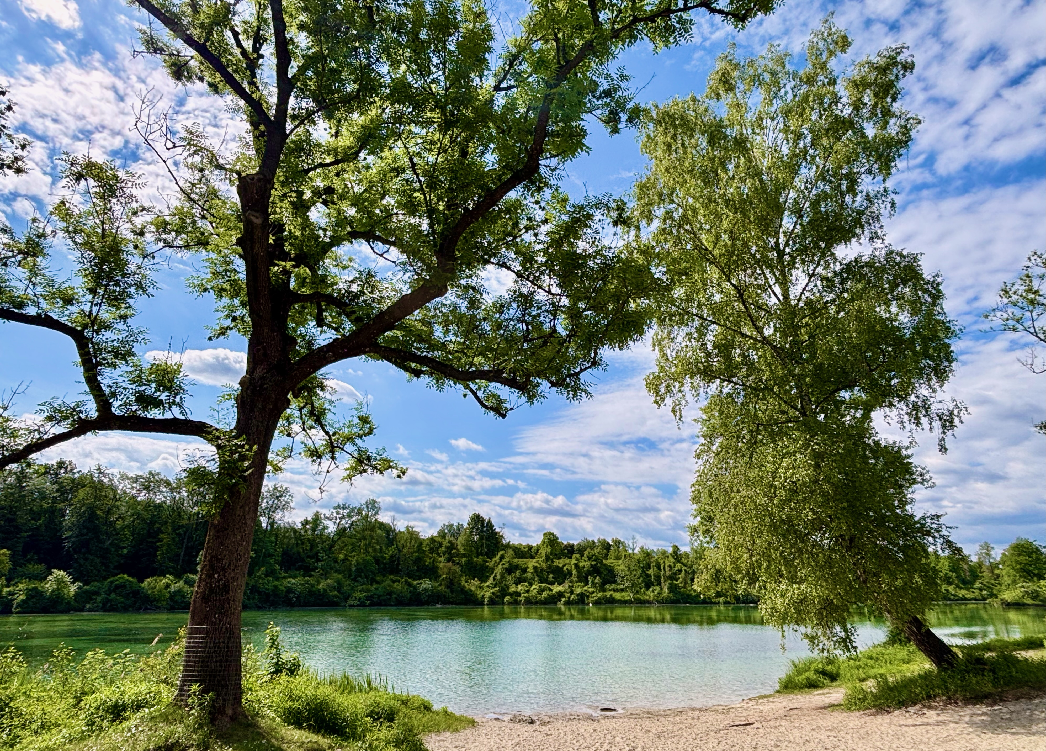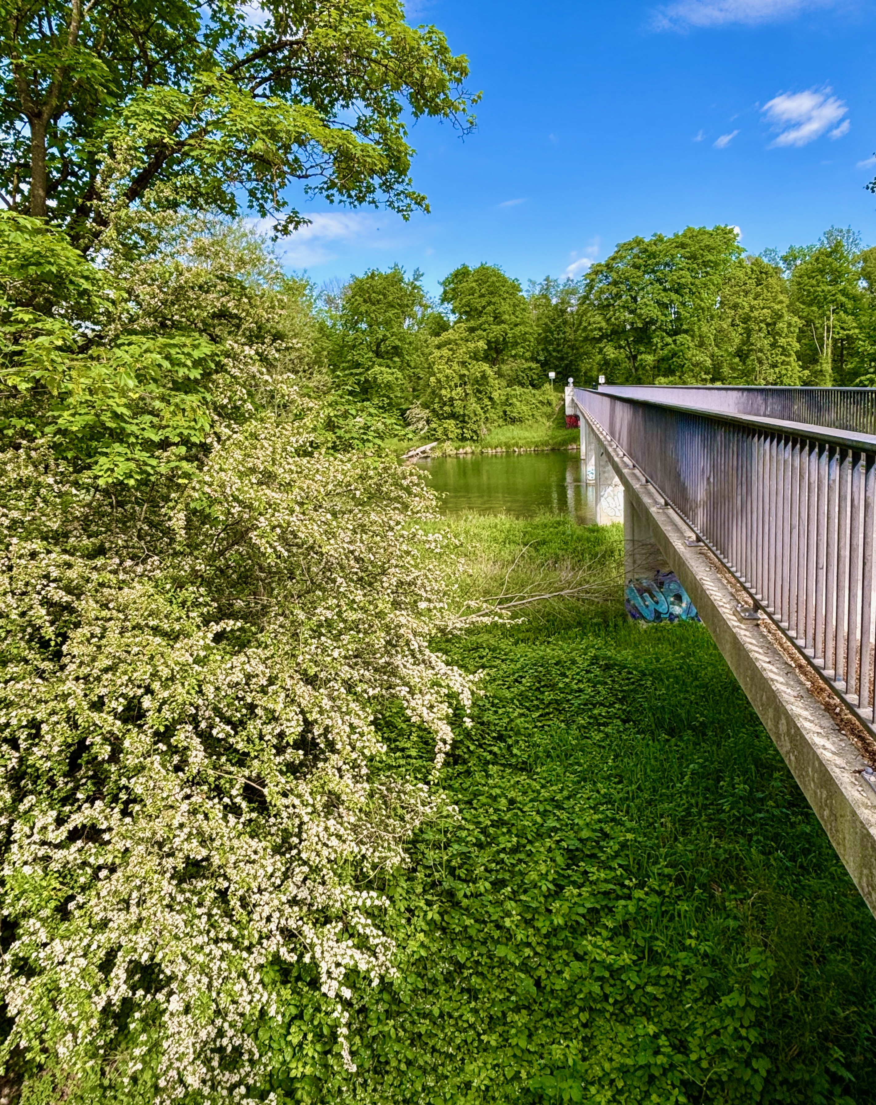 Cutting across to the path running along the small lake Poschinger Weiher leads to a short, but steep ascent up to a viewpoint overlooking the city with the Alps visible in the far distance.