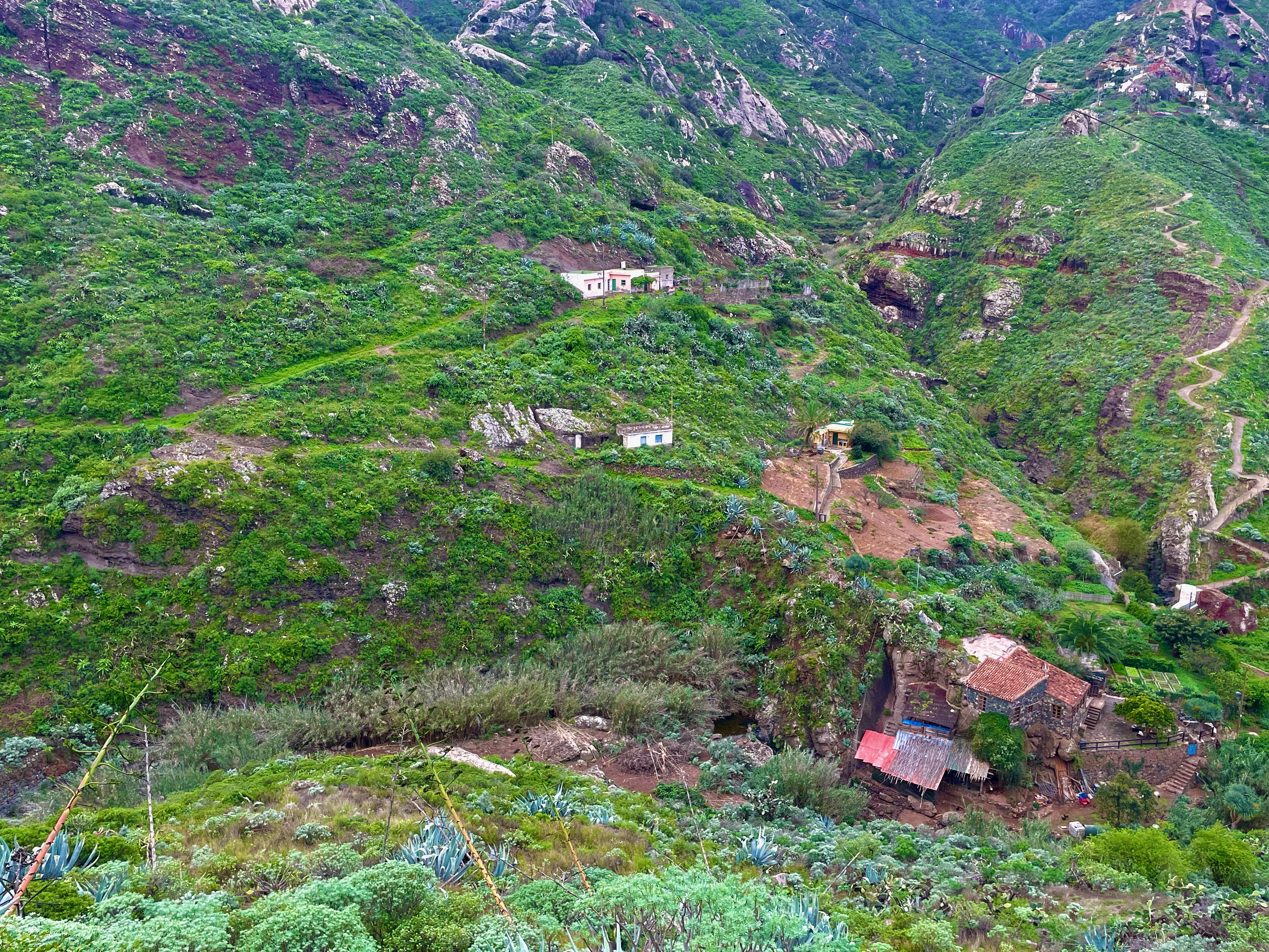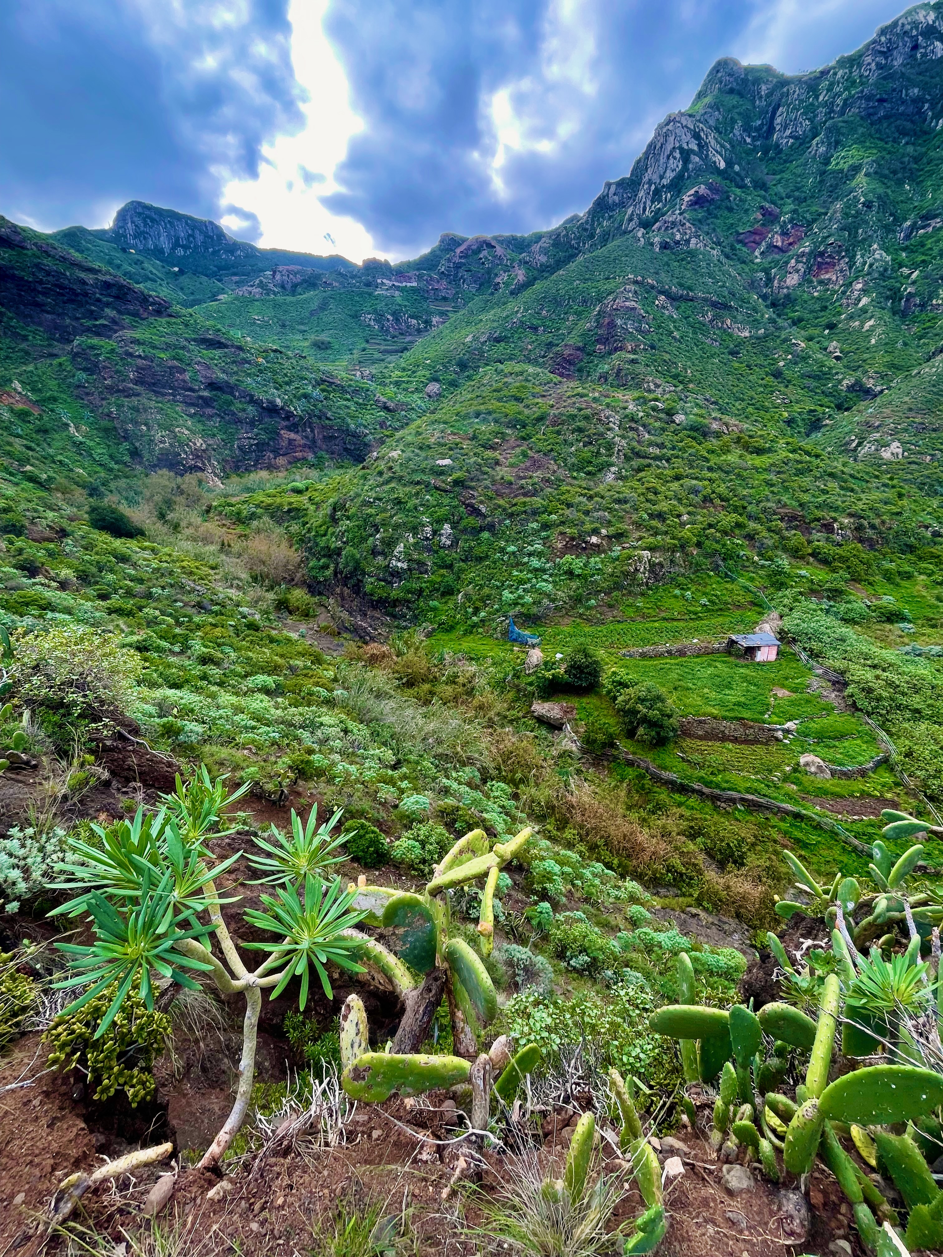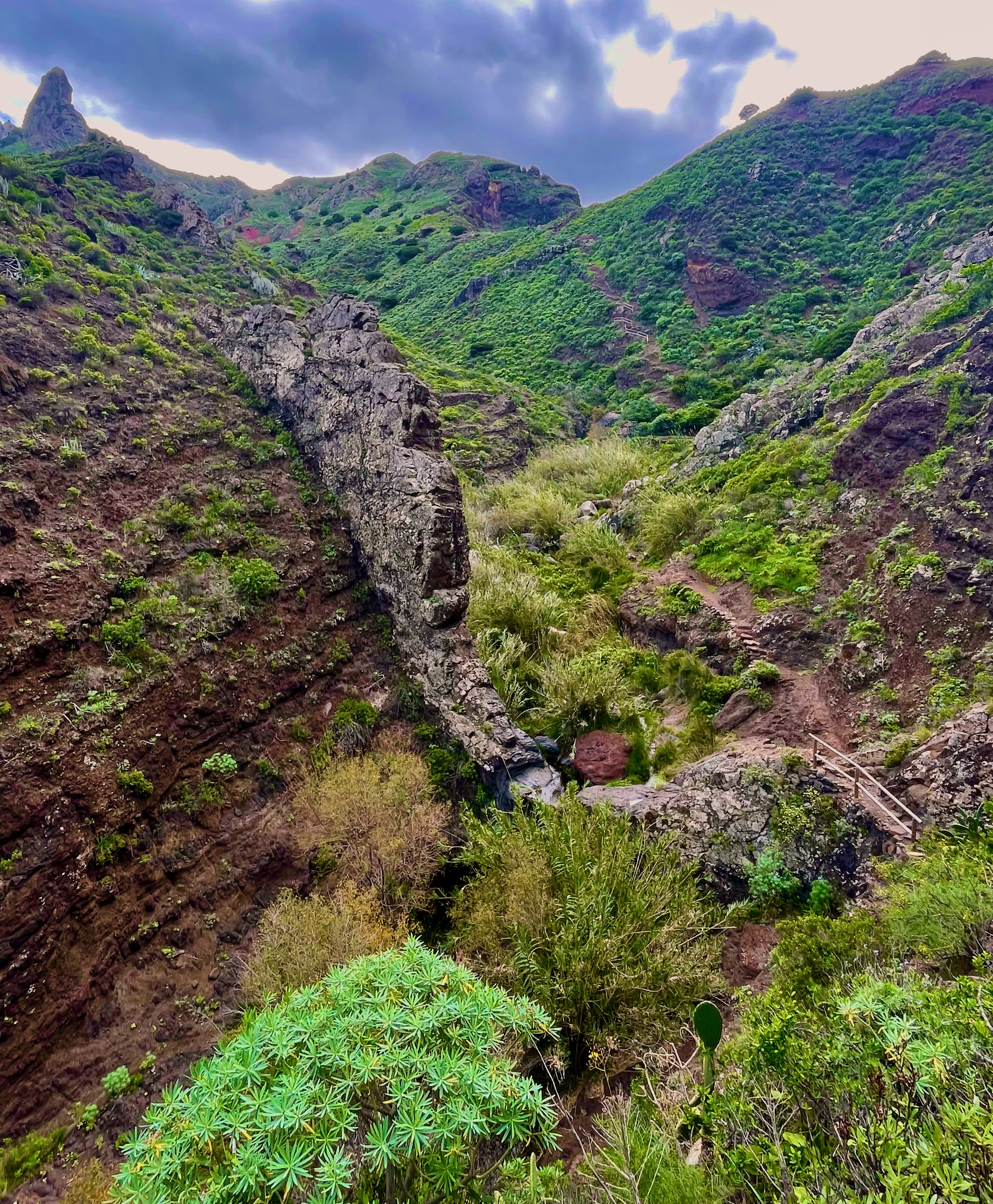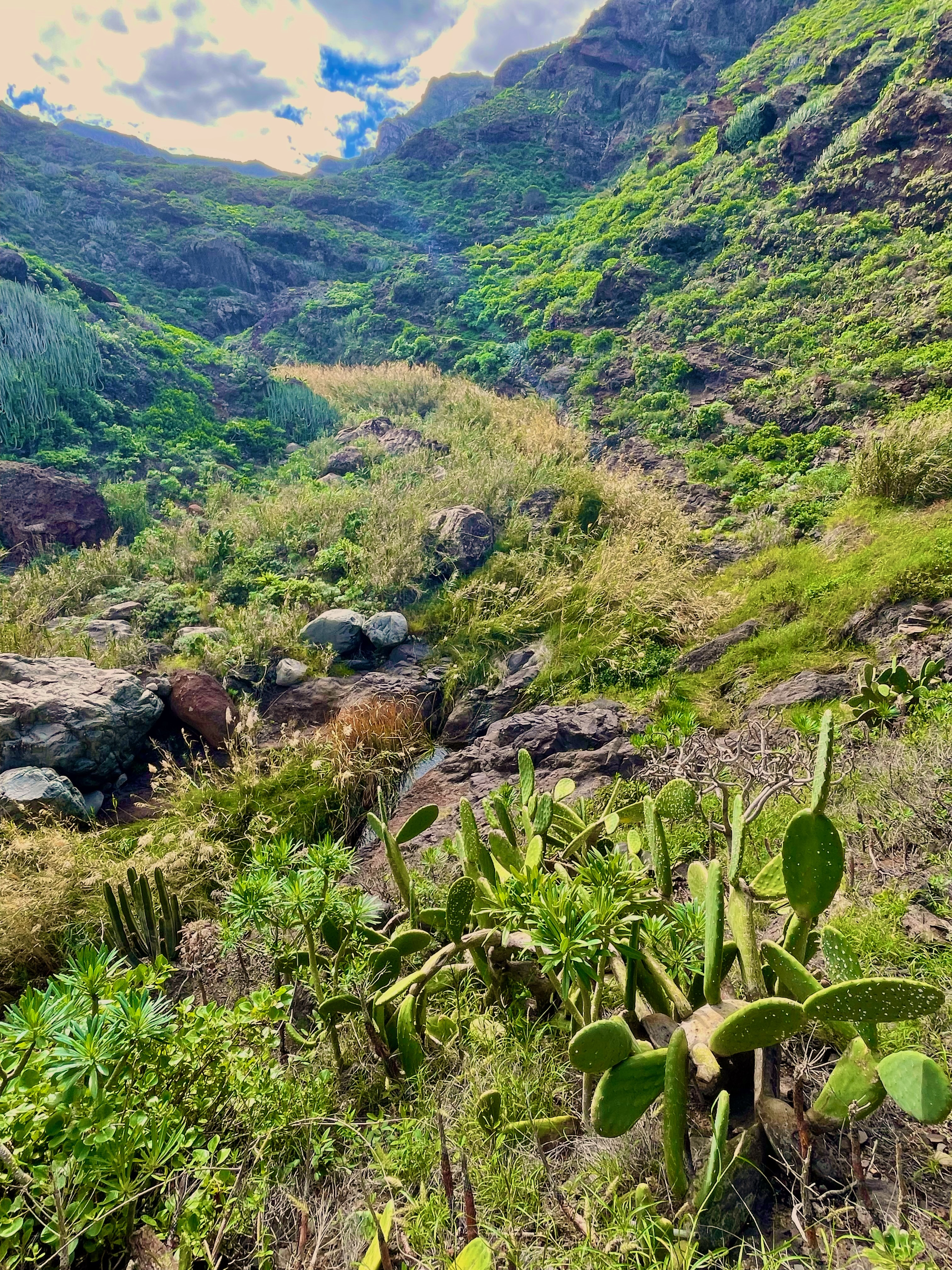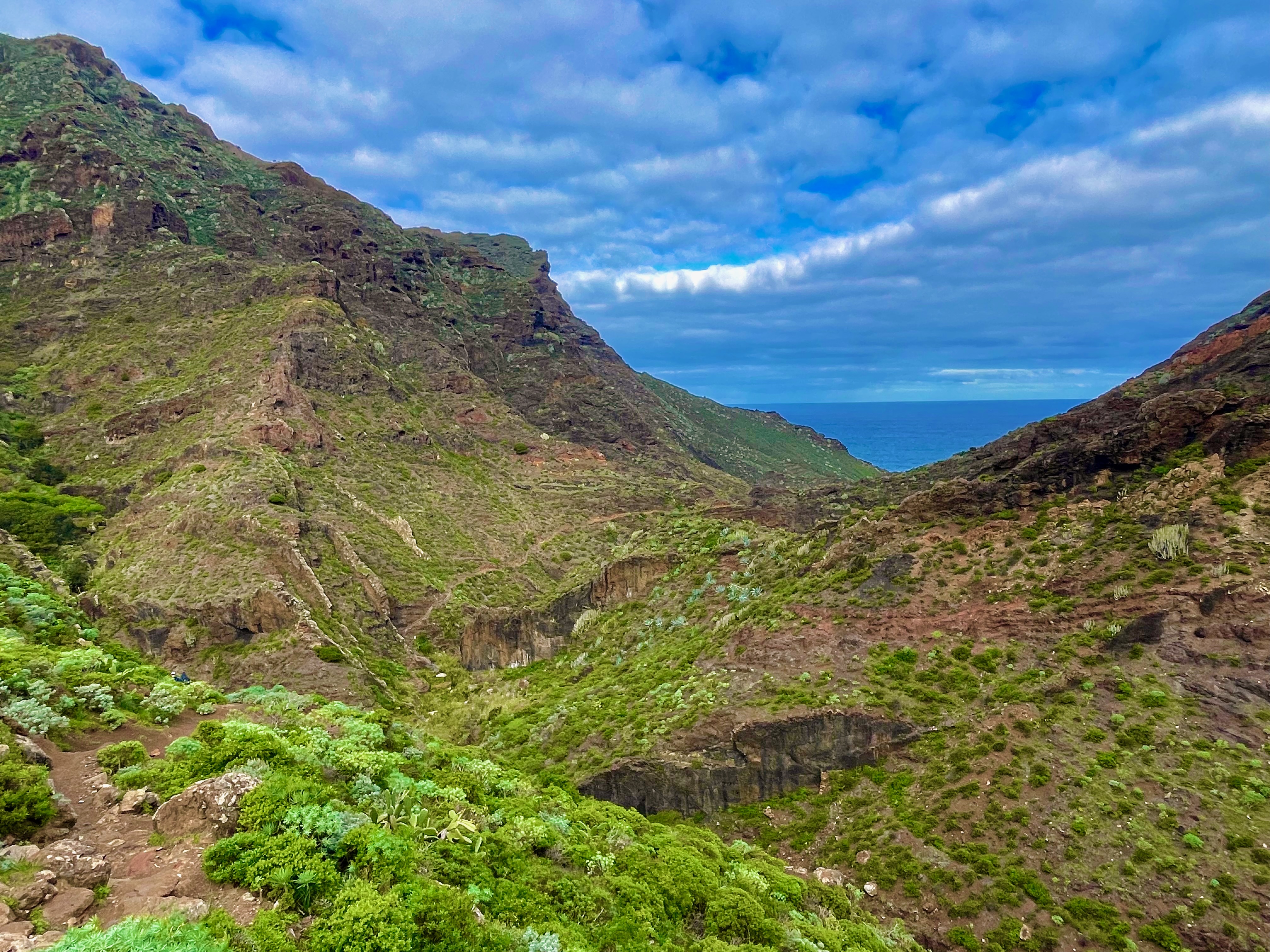 Starting in the picturesque village of Taganana, which is well worth a visit and quite a popular tourist destination, a steep trail climbs high above the sea into the lush green hills to the magnificent views from Mirador de Cumbrecilla, 600m above sea level – the highest point of the run. A wider track and a stretch of paved road take us back down to the hamlet of Afur, where the gorge begins.
