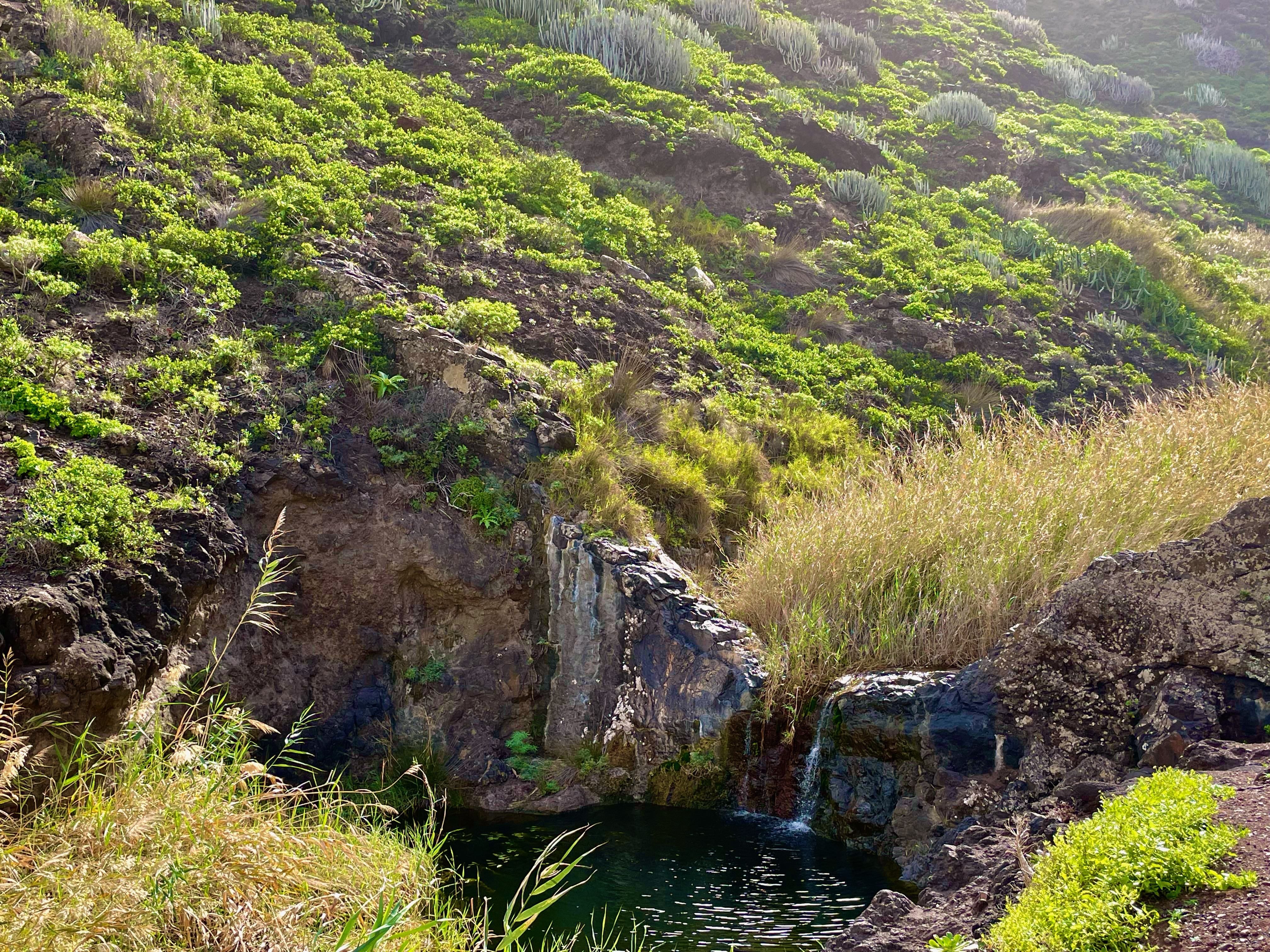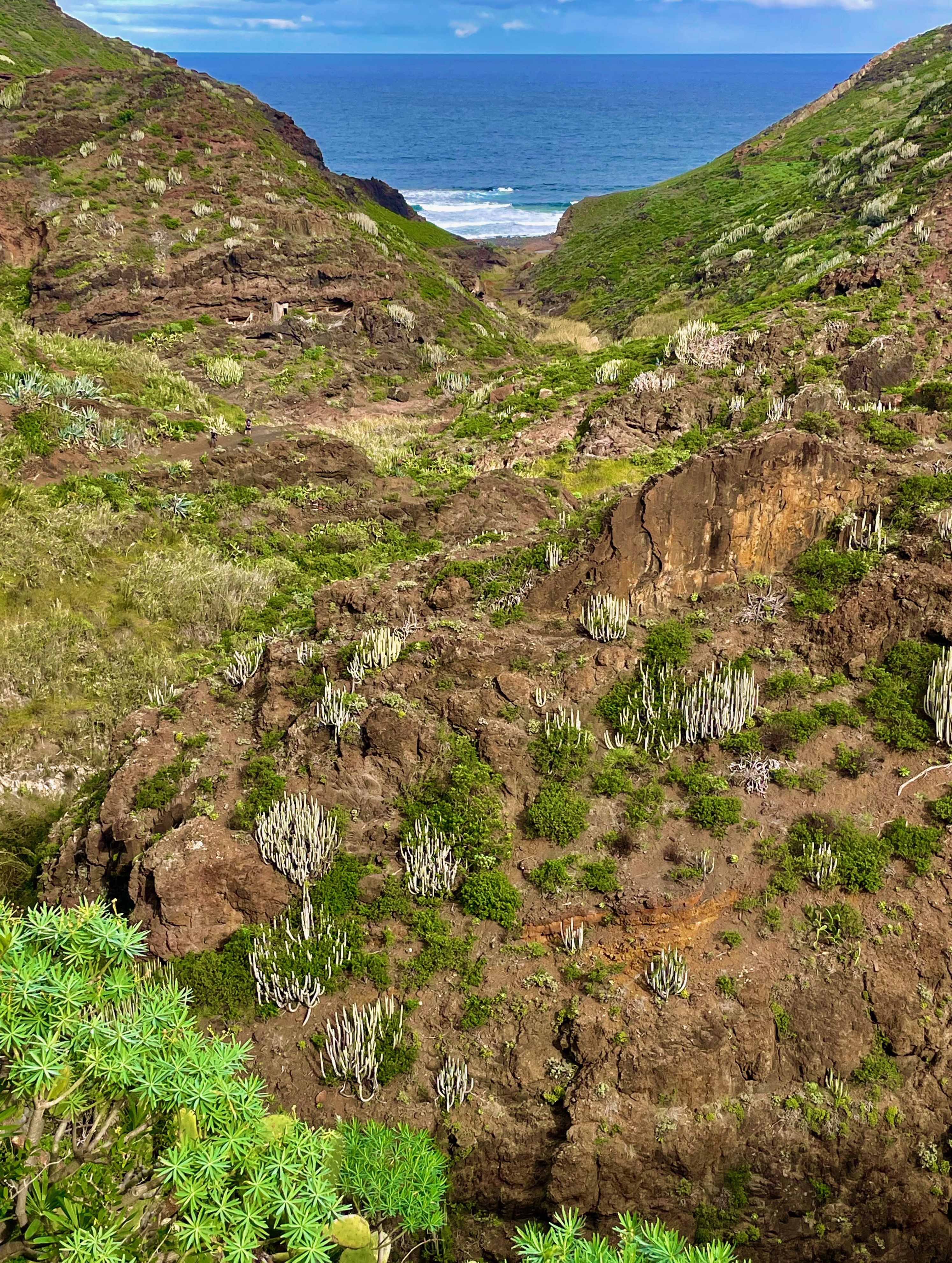 A moderately technical trail offers glimpses of ocean as we make our way down through mesmerizing flora. It is slow-going and well worth taking your time, until we reach the serene, lonely Playa de Tamadite populated by a single shepherd’s hut.