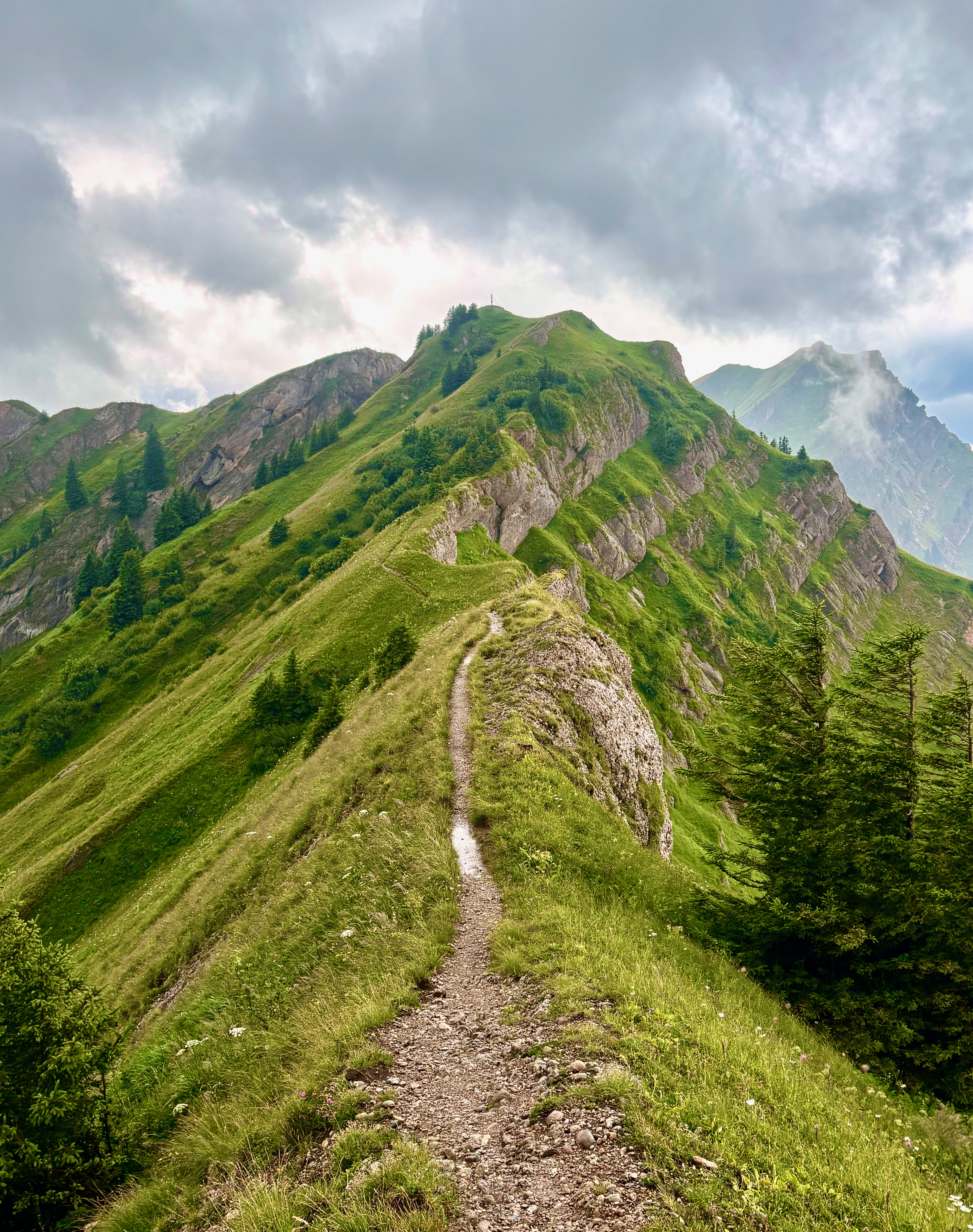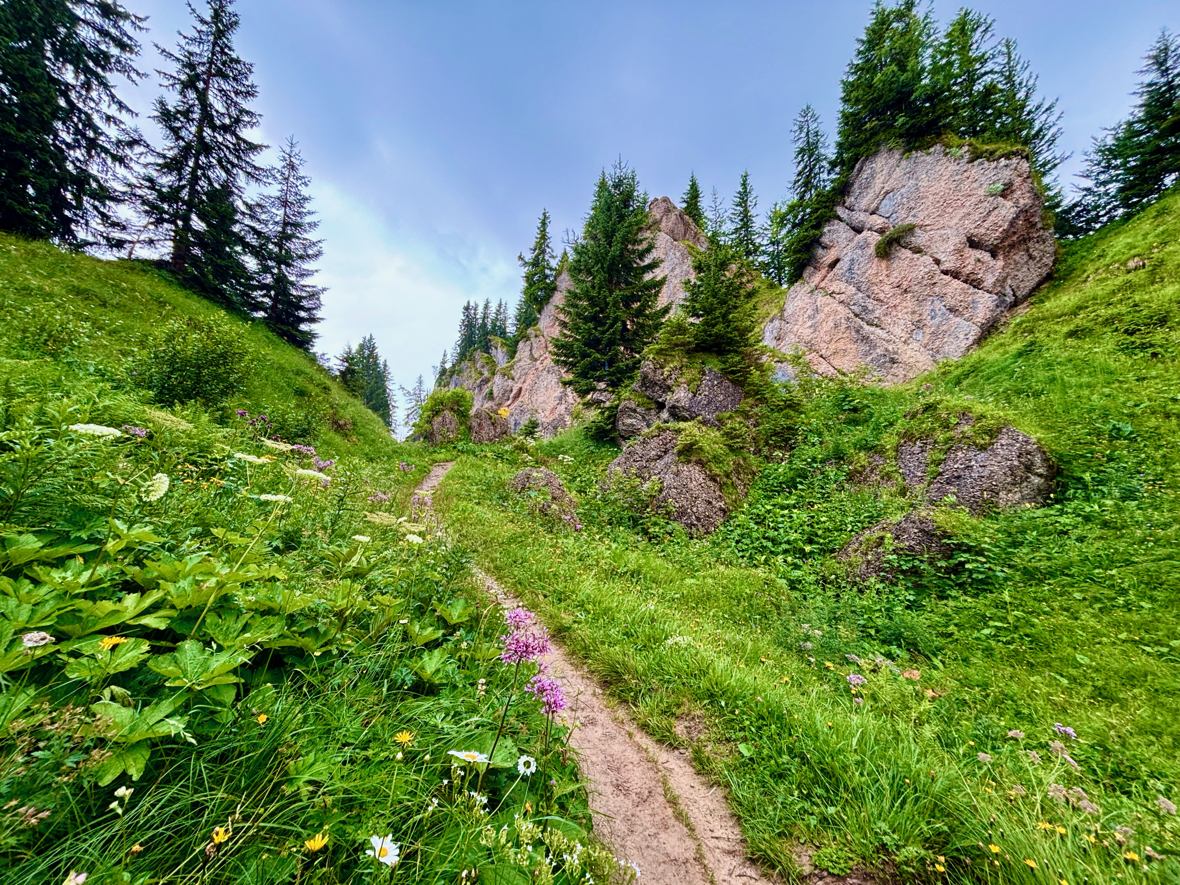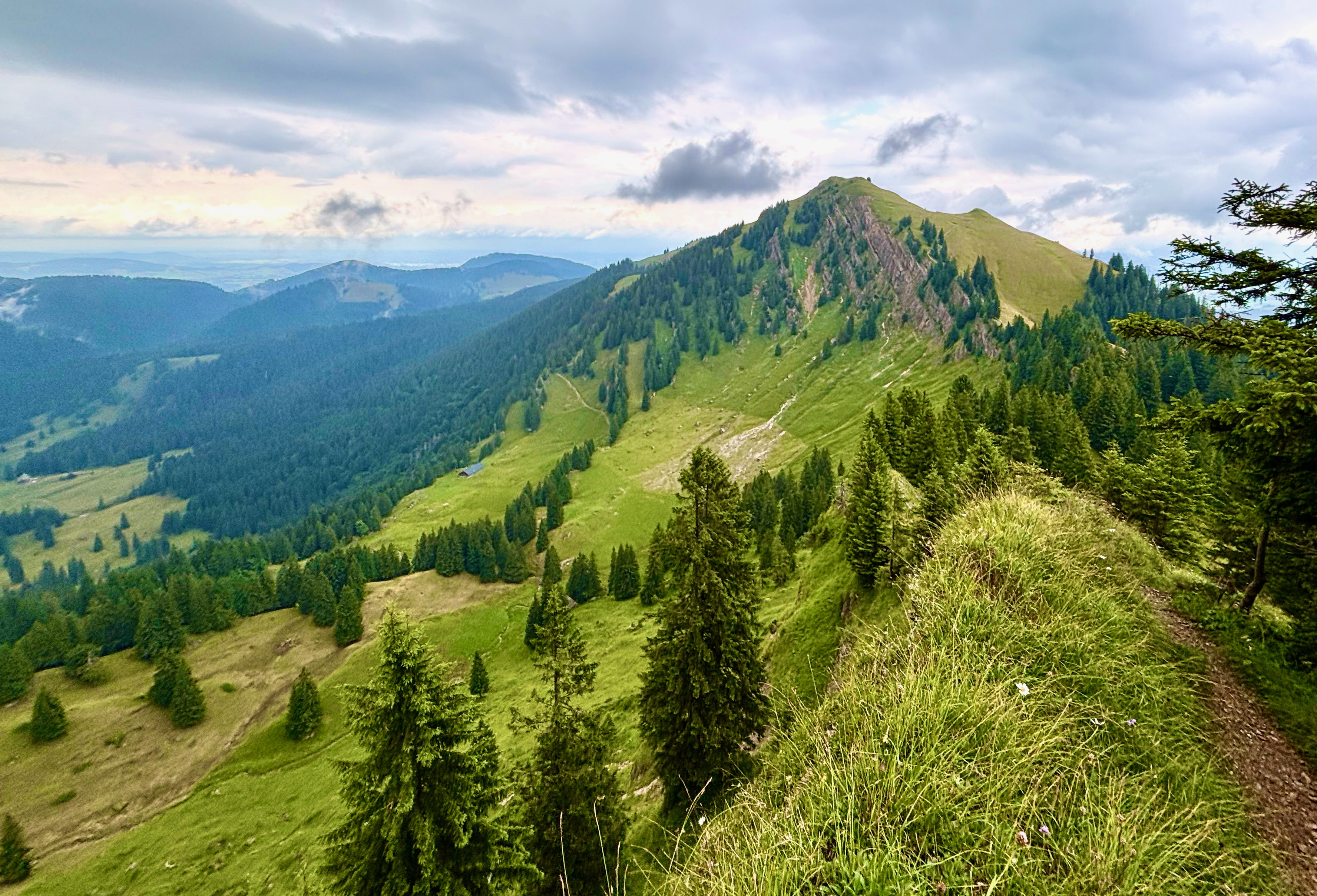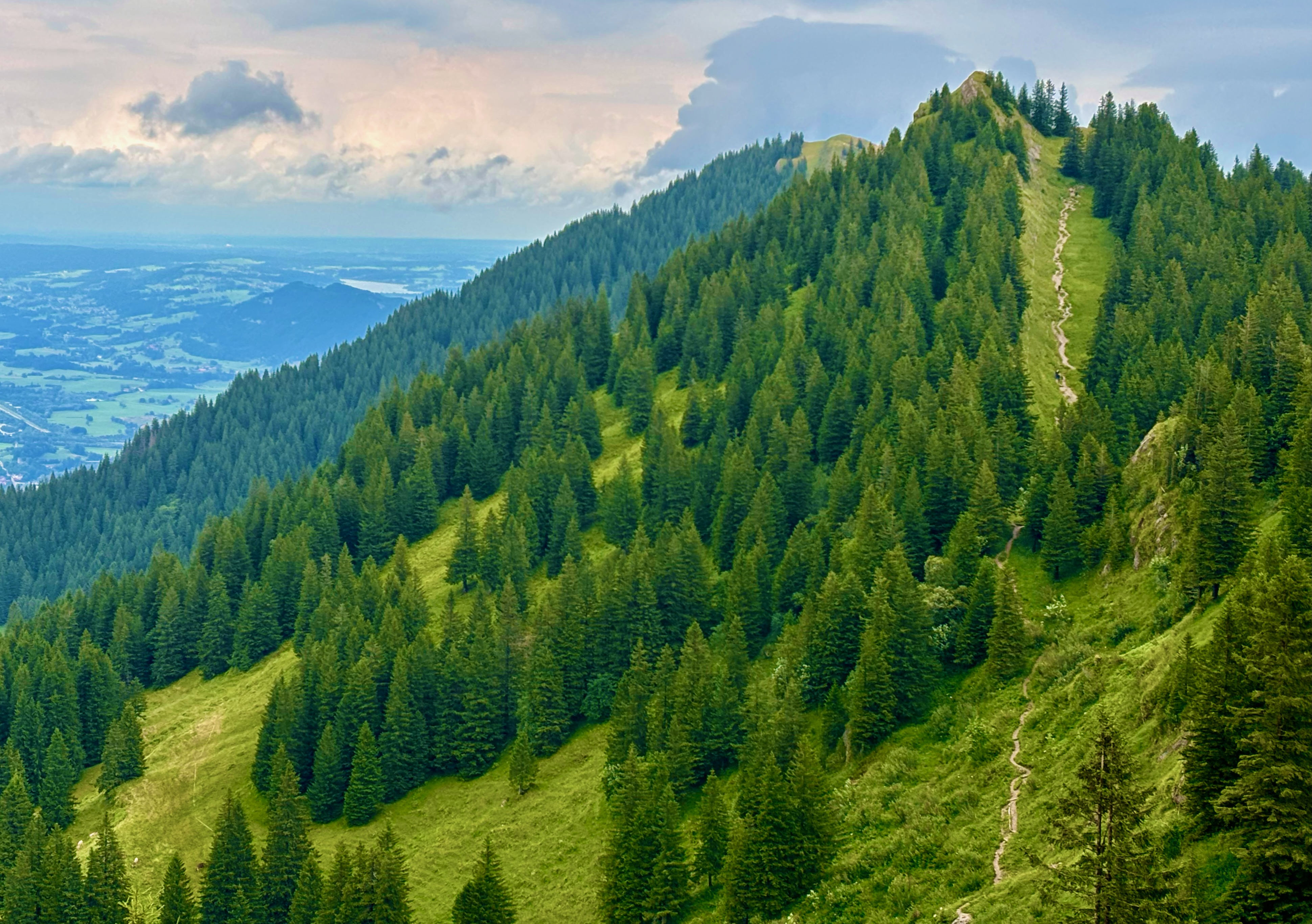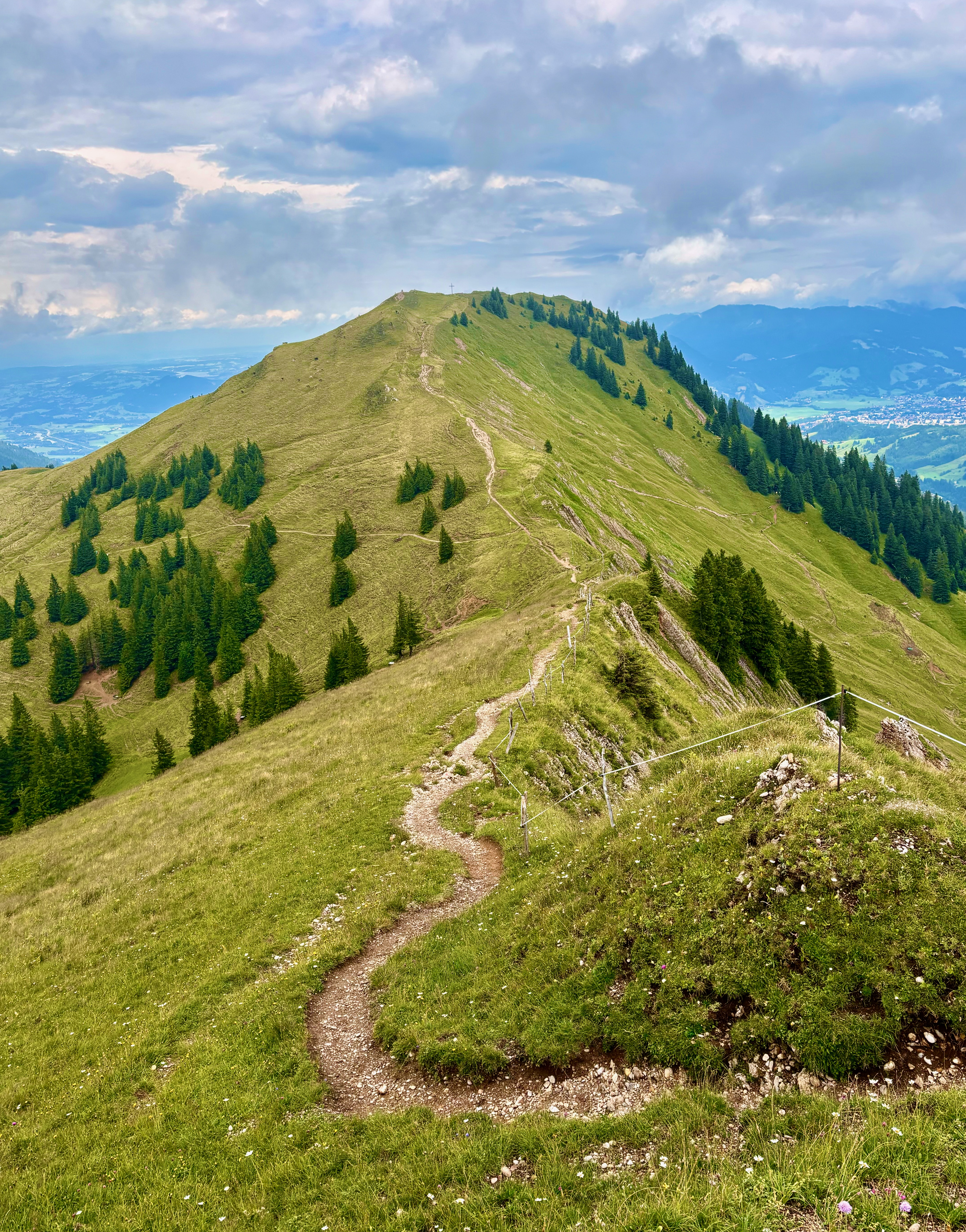 After the final peak of our loop, Gündleskopf, the trail descends into the valley across deeply green meadows.