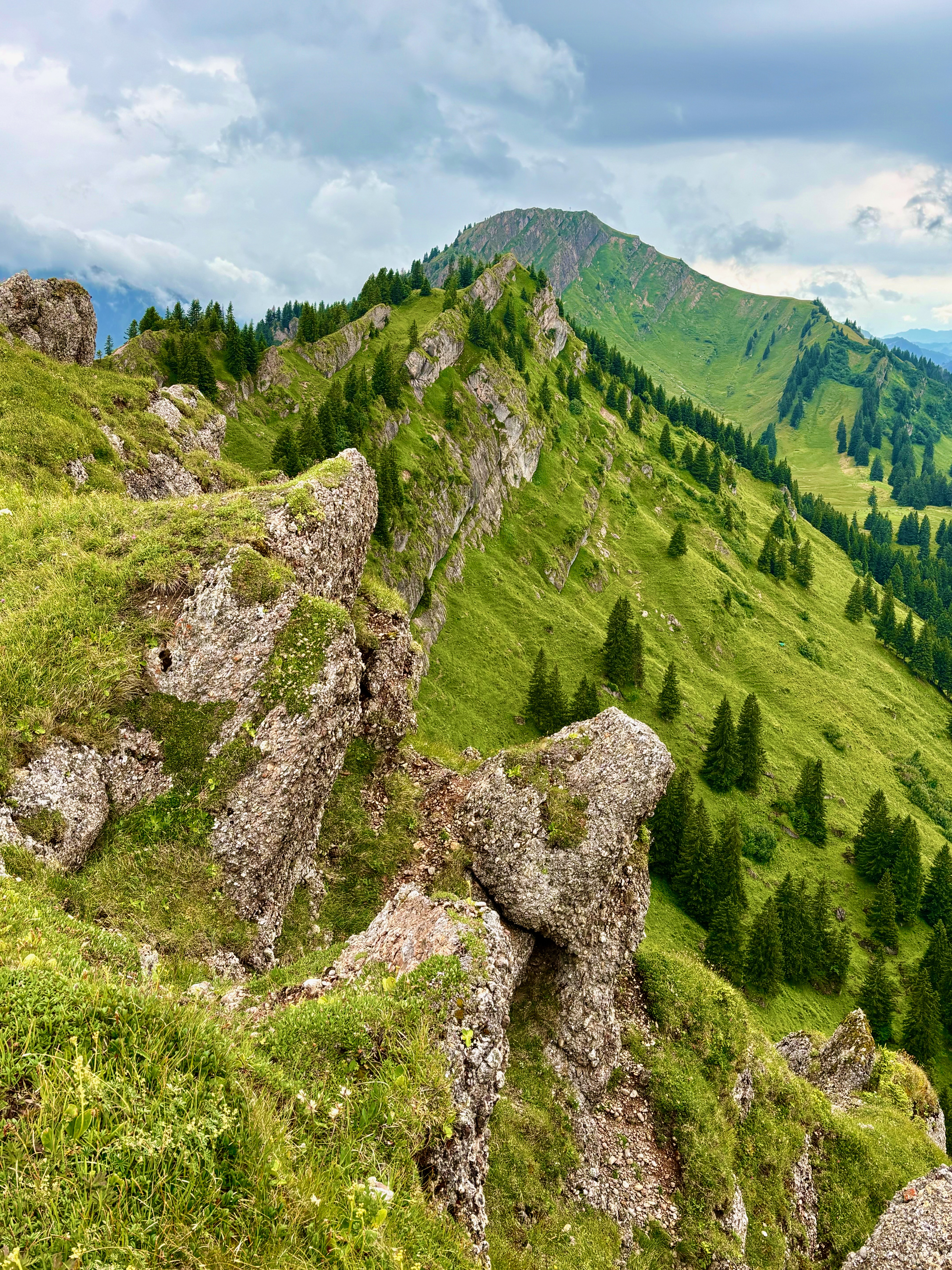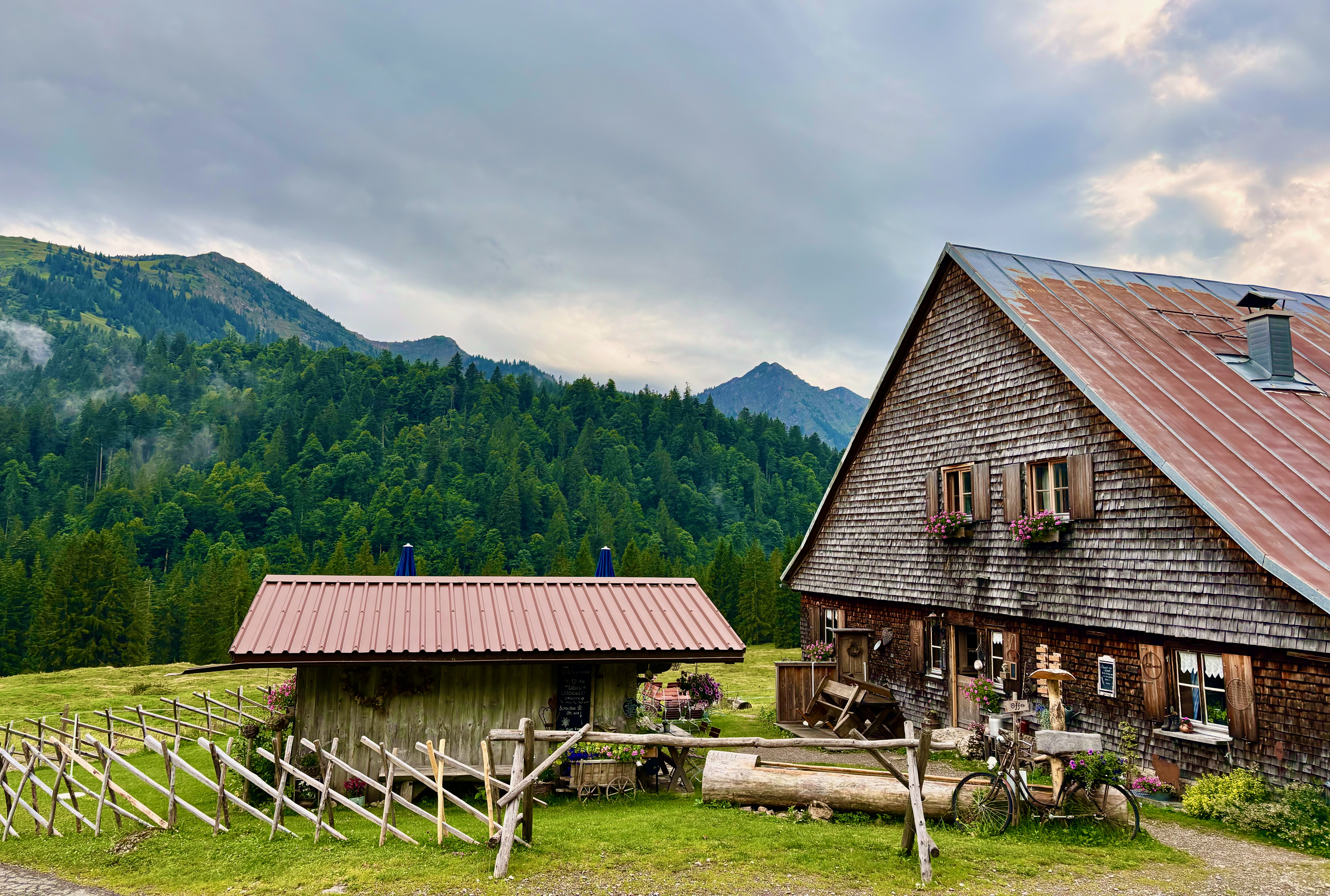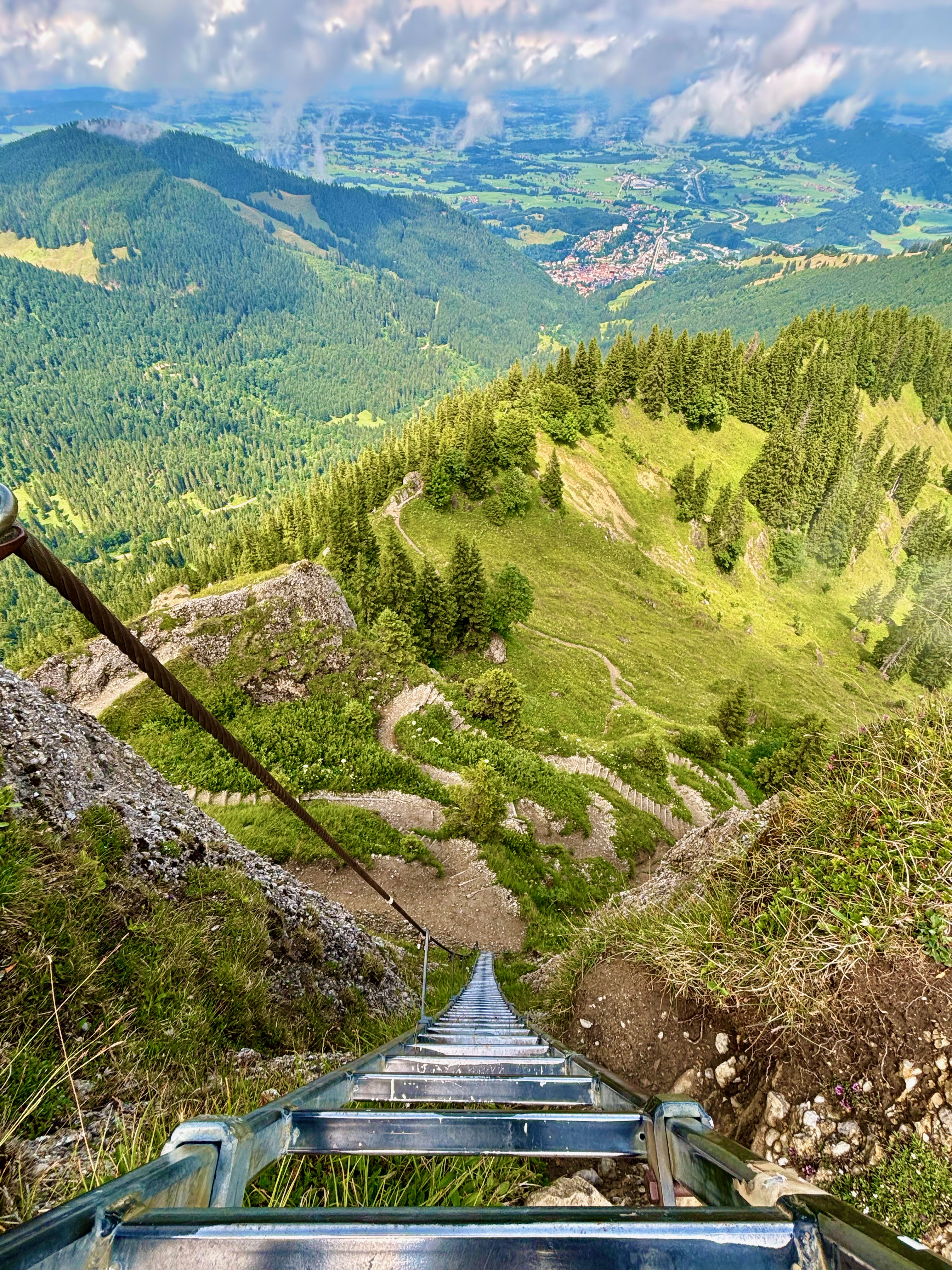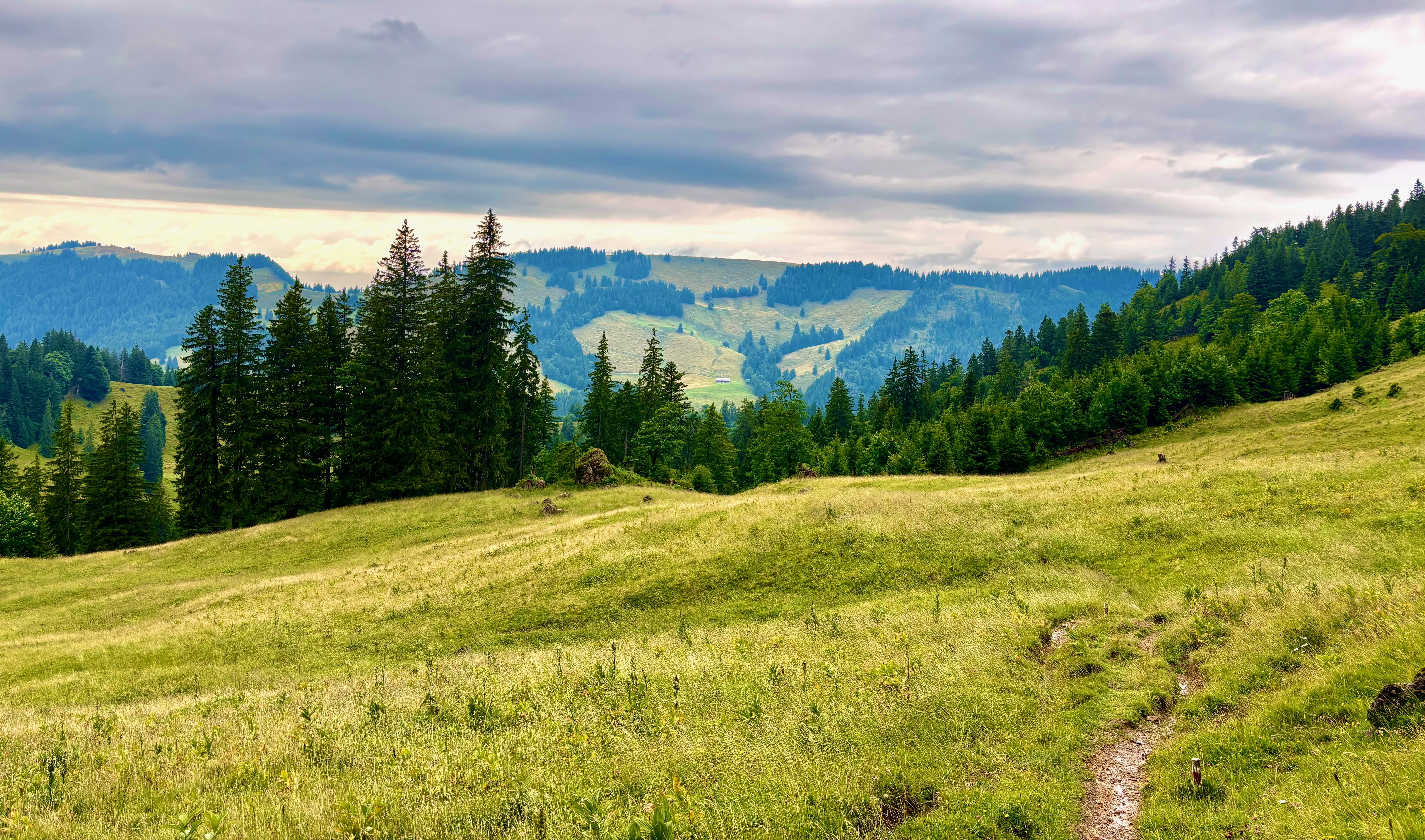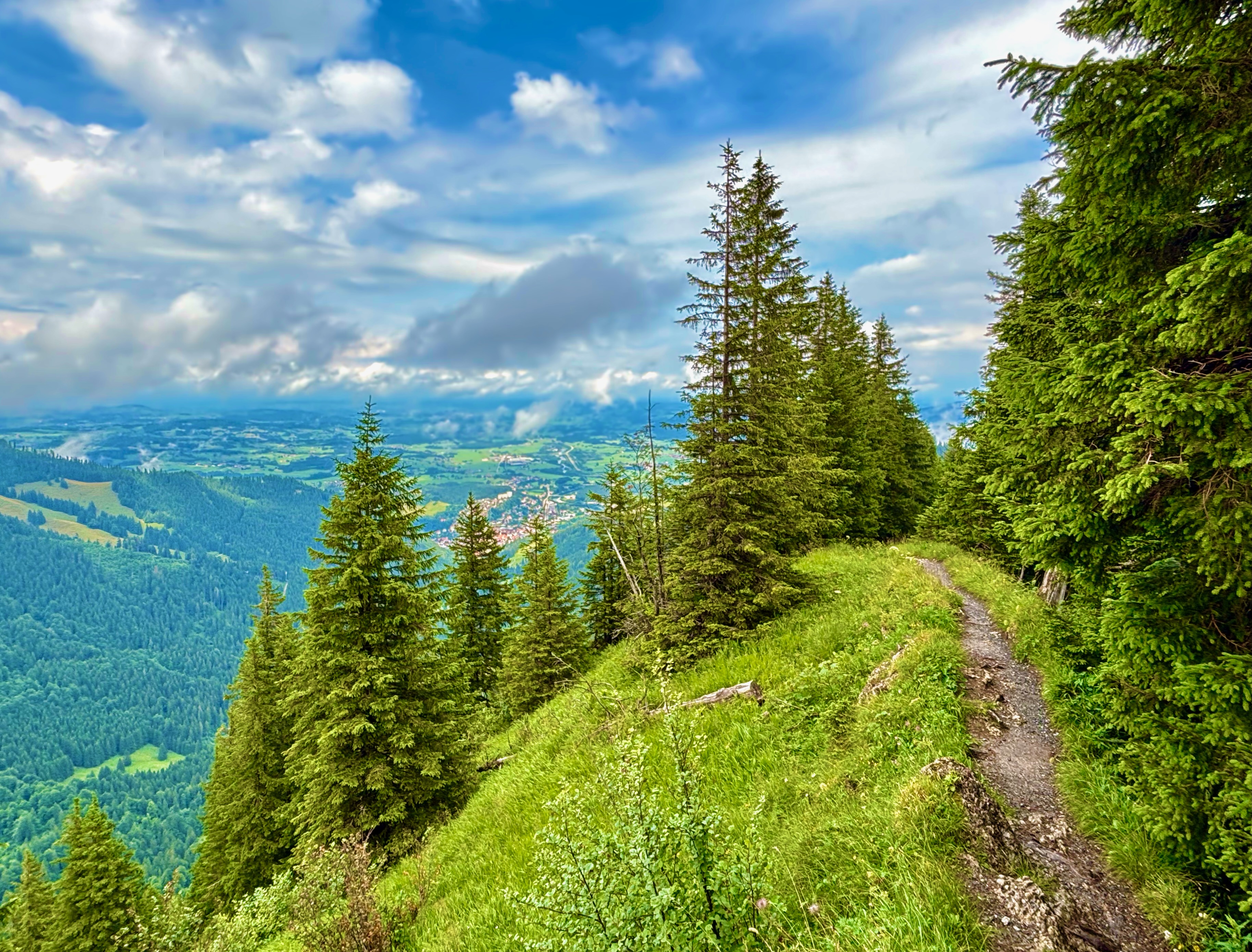 After the final peak of our loop, Gündleskopf, the trail descends into the valley across deeply green meadows.
