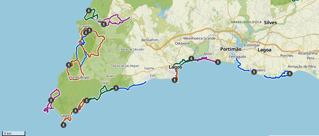 In and around Lisbon I combine coastal tracks and hill running with city runs passing major sights. The Sintra hills petering out at Europe’s westernmost point on the Atlantic coast are criss-crossed by hiking paths and shared mountain bike trails connecting peaks dotted with monumental castles. The fishing town of Ericeira makes for a delightful destination to get out of the city. All routes are within an hours drive from one of my favorite European capitals – they start locally in Ericeira or Ulgueira simply because I stayed in these villages.