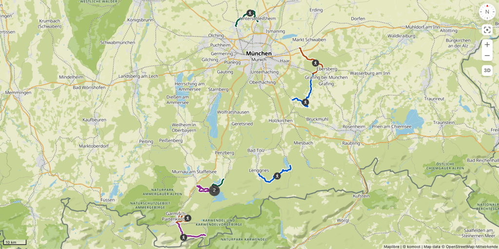 I started this collection to take advantage of the widespread public transportation network around Munich (S-Bahn and regional trains). All tracks are lengthy, one-way runs, starting at one train station and ending at another for the return journey to the city, which makes them an excellent choice for a car-free day trip. This feature makes many of the routes quite unusual and off the beaten track.